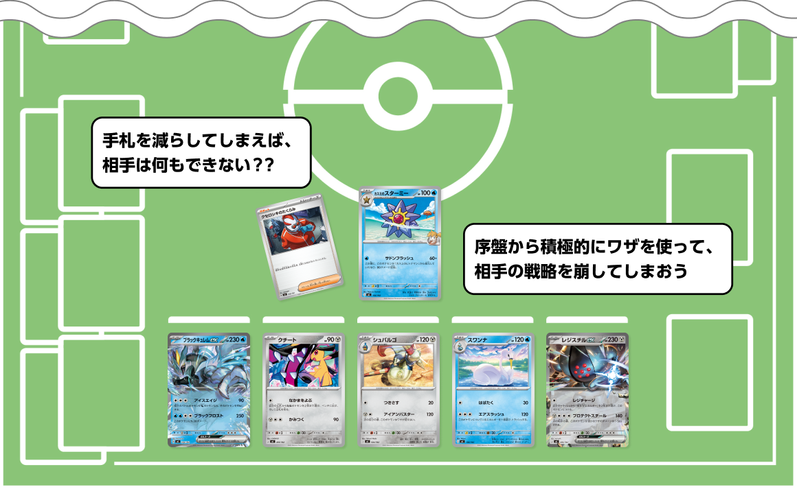クセロシキのたくらみは、相手の手札を3枚に減らしてしまう効果を持つサポート。どんなに強力なカードも、使えなければ怖くないぞ。思い通りにプレイできない相手を、少ないエネルギーで使えるワザを持つポケモンで攻め立てよう。