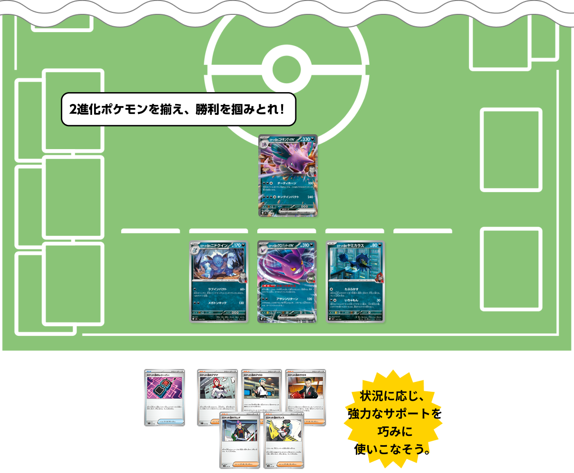 ロケット団の幹部が描かれたサポートを巧みに使い分け、ロケット団のニドキングexとロケット団のニドクインを場に展開。盤面を支配し、強力な2進化ポケモンで勝利を掴み取ろう。