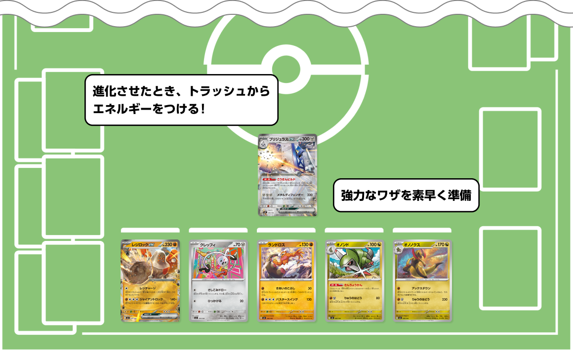 トラッシュのエネルギーをポケモンにつけるワザや特性を持つポケモンたちがそろったデッキ。ブリジュラスexの特性「ごうきんビルド」やレジロックexのワザ「レジチャージ」でエネルギーを加速して、強力なワザで戦おう。