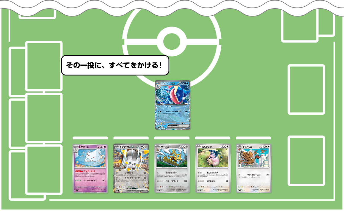 - ゲッコウガexはコインがウラでも相手にダメージを与えられるワザ「へんげんしゅりけん」を持つので相手を確実に「きぜつ」させたい時のために準備しよう。