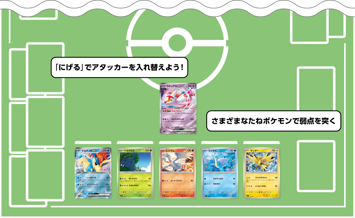 さまざまなタイプのたねポケモンが入っているこのデッキとラティアスexの特性「スカイライン」は相性バッチリ。相手のポケモンに合わせて、弱点をつくことができるポケモンで戦おう。