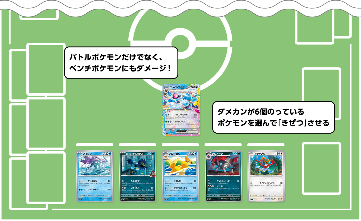 - ベンチポケモンにもダメージを与えられるワザで、積極的にベンチポケモンを「きぜつ」させることがコツ。