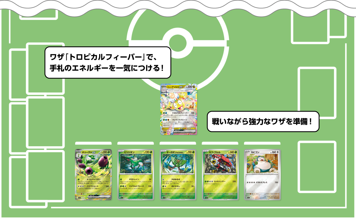 - ダメージを与えつつ、場のエネルギーを増やせるワザ「トロピカルフィーバー」でベンチポケモンを育てよう。