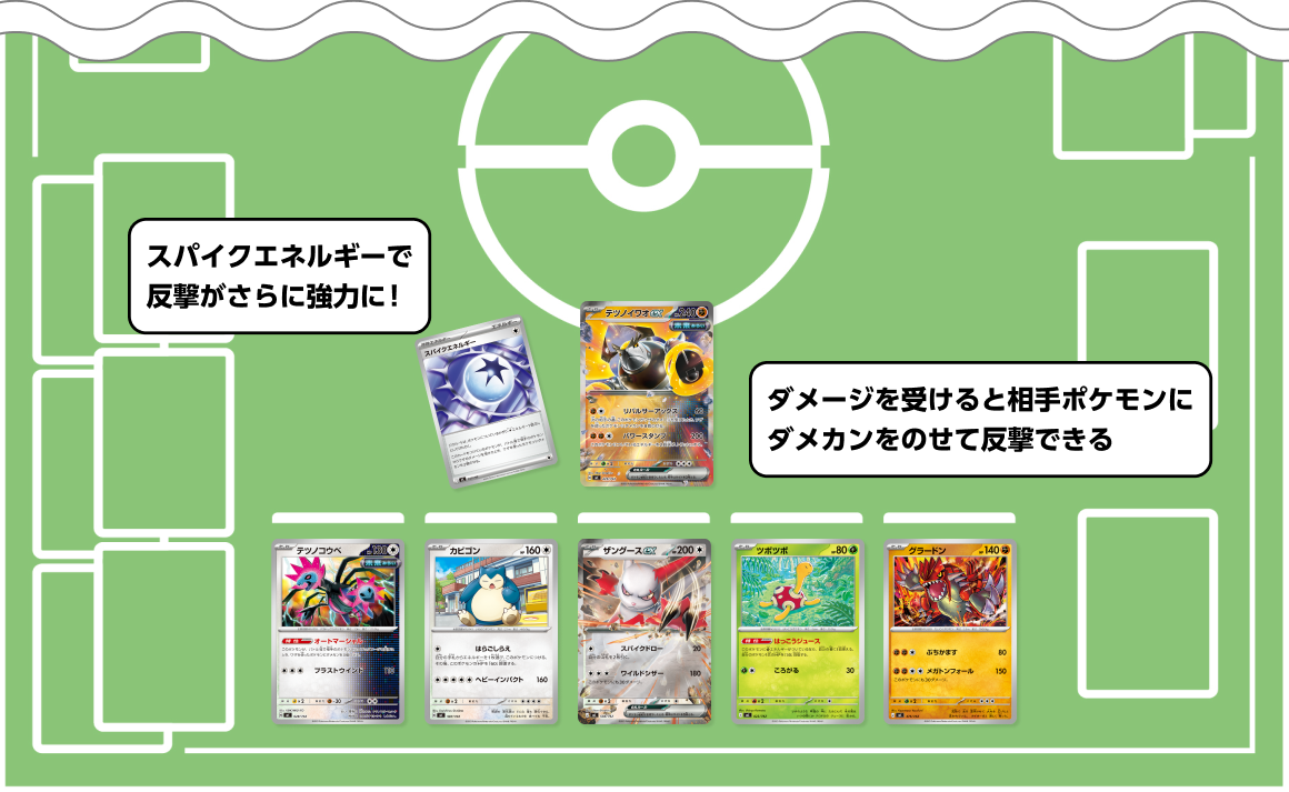 つけたポケモンがワザのダメージを受けたとき、相手ポケモンにダメカンを2個のせる特殊エネルギー。テツノイワオexやテツノコウベなどにつけよう。