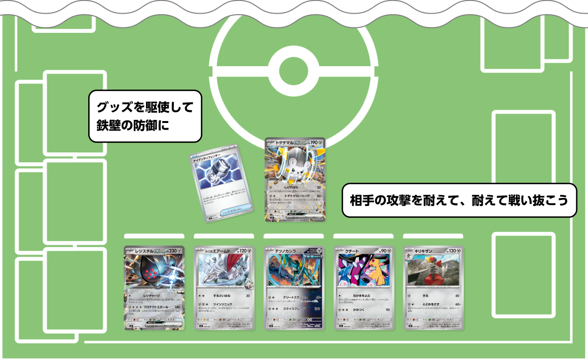 鋼ポケモンが受けるダメージを「−30」するアイアンディフェンダーを駆使するデッキ。レジスチルexやトゲデマルexなど、強力なポケモンを守って、連続でワザを使おう。