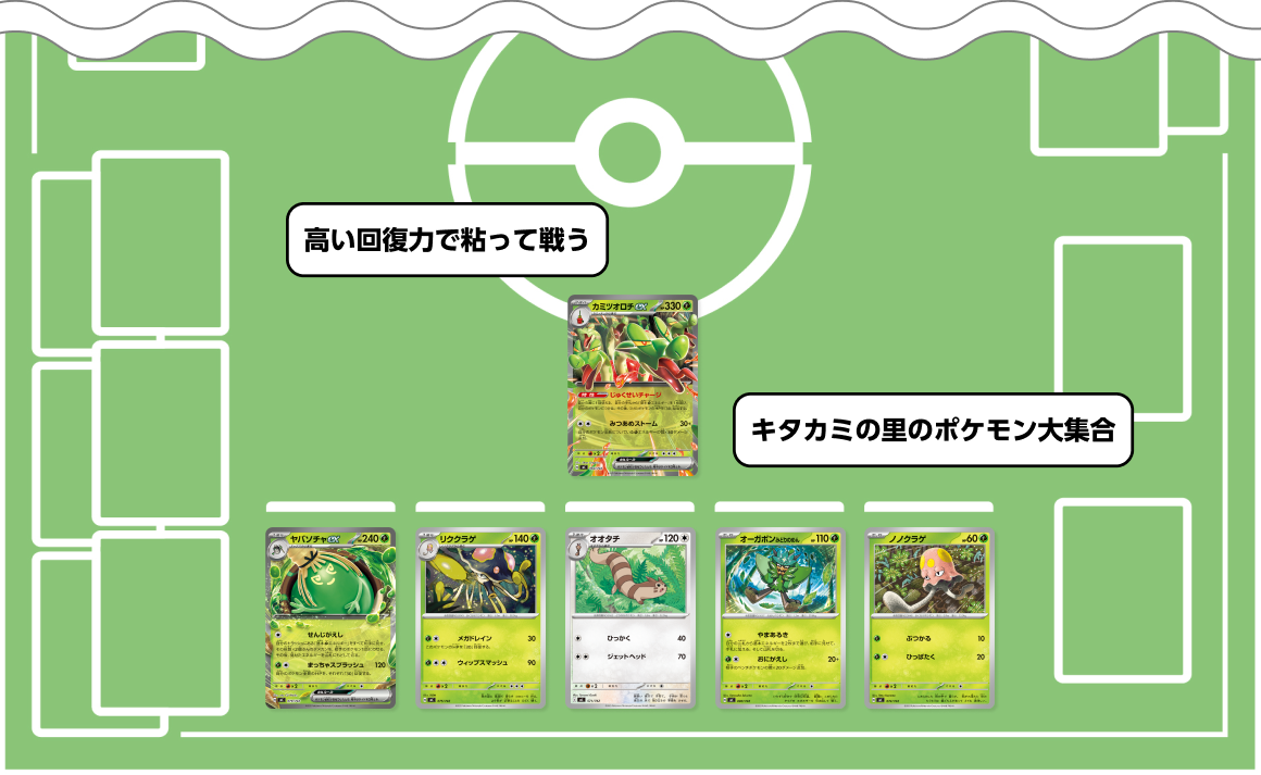 HPを回復する特性やワザを持ったポケモンが主力のデッキだ。回復しながら、「にげる」やポケモンを入れ替えるトレーナーズをうまく使って、長くしぶとく戦おう。