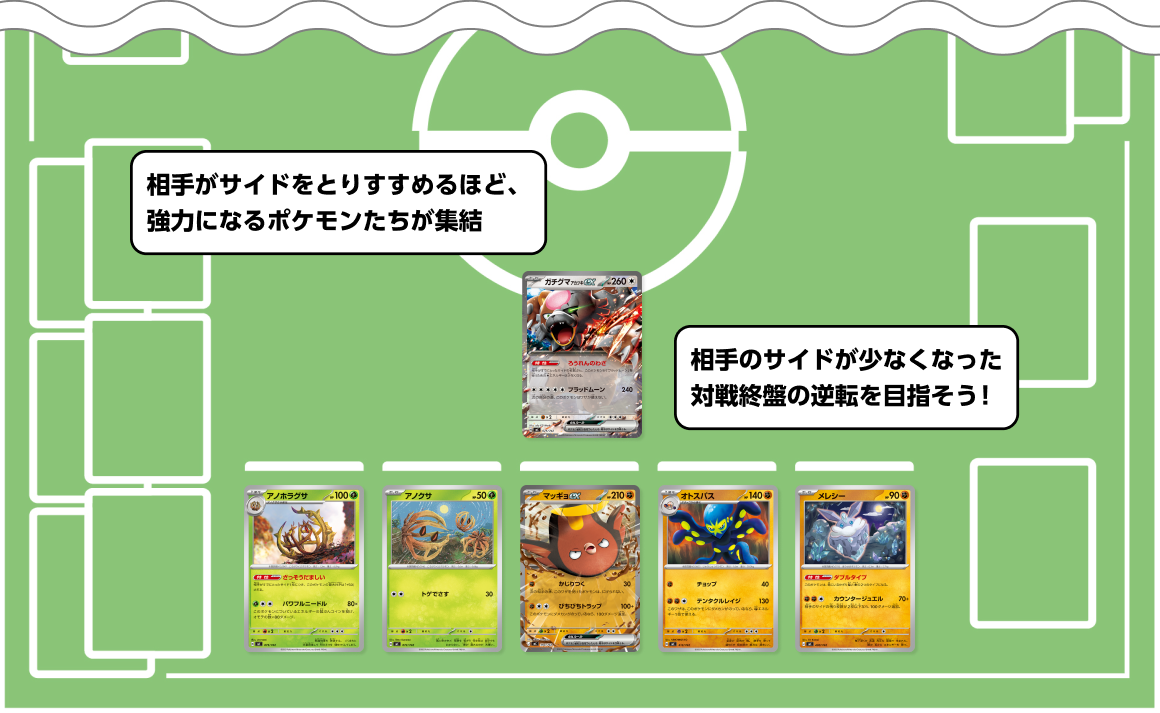 大逆転を目指して、粘り強く戦おう。序盤はポケモンたちにエネルギーをつけて育て、逆転への準備を整えよう。対戦終盤は、相手がサイドをとり進めるほど強力になるアノホラグサやガチグマ アカツキexで勝負を決めよう。