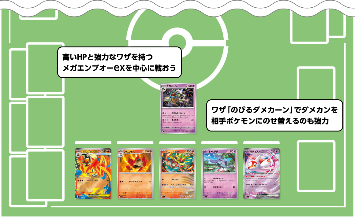 メガエンブオーexのワザ「クリムゾンボム」は、使うたびに60ダメージを受けてしまう。デスカーンのワザ「のびるダメカーン」を使えば、メガエンブオーexにのっているダメカンをすべて相手のポケモン1匹にのせ替えることができるぞ。