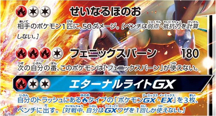 ホウオウGXの強みは、何といってもGXワザの「エターナルライトGX」です。 進化に関係なく、トラッシュから直接ベンチに炎ポケモンを出すことができます。