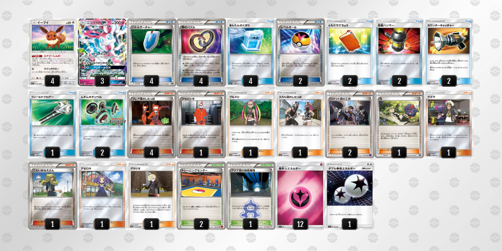 ニンフィアGXを中心として、相手の行動を妨害しつつ、まんたんのくすりで回復させながら、相手の山札切れを狙うデッキです。