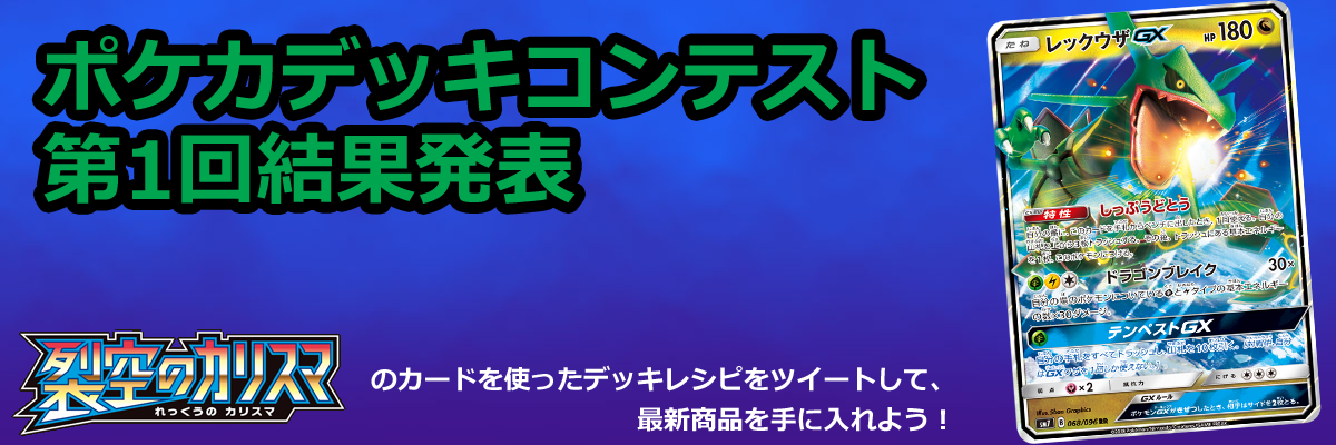 #ポケカデッキコンテストに多数のデッキレシピを投稿いただき、ありがとうございました。裂空のカリスマを使ったポケカデッキコンテストの第1回結果発表ということで、4つのデッキを紹介いたします。また、今回はポケカ四天王の一角、「世界で二番目に強い男」スズキ ナオト選手にレックウザGXのデッキレシピを作成いただきました!