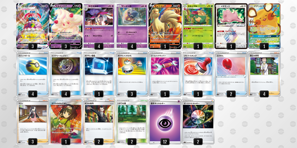 キュウコンVは、マホイップVMAXが苦手な鋼タイプが相手のとき、ないしは「伝説の鼓動」で初登場したアメイジングレアのポケモンたちを相手にするときにとても力になってくれそうだと思いました! 2つのワザのどちらとも、必要とするエネルギーが炎エネルギー1つと無色エネルギーなので、オーロラエネルギーとともに採用してみました。ワザ「きゅうびへんげ」でアメイジングレアのポケモンたちのワザをコピーして使えたらとっても強そうですよね......! ジラーチのワザ「アメイジングスター」をコピーすればエネルギー7枚つけられて、次の番にマホイップVMAXのワザ「キョダイホイッパー」で大ダメージを狙えますし、ライコウのワザ「アメイジングシュート」をコピーすればそのライコウを反対にきぜつさせ、ベンチにいる他のポケモンにも大ダメージが......! 夢が広がりますなぁ(にこにこ)
